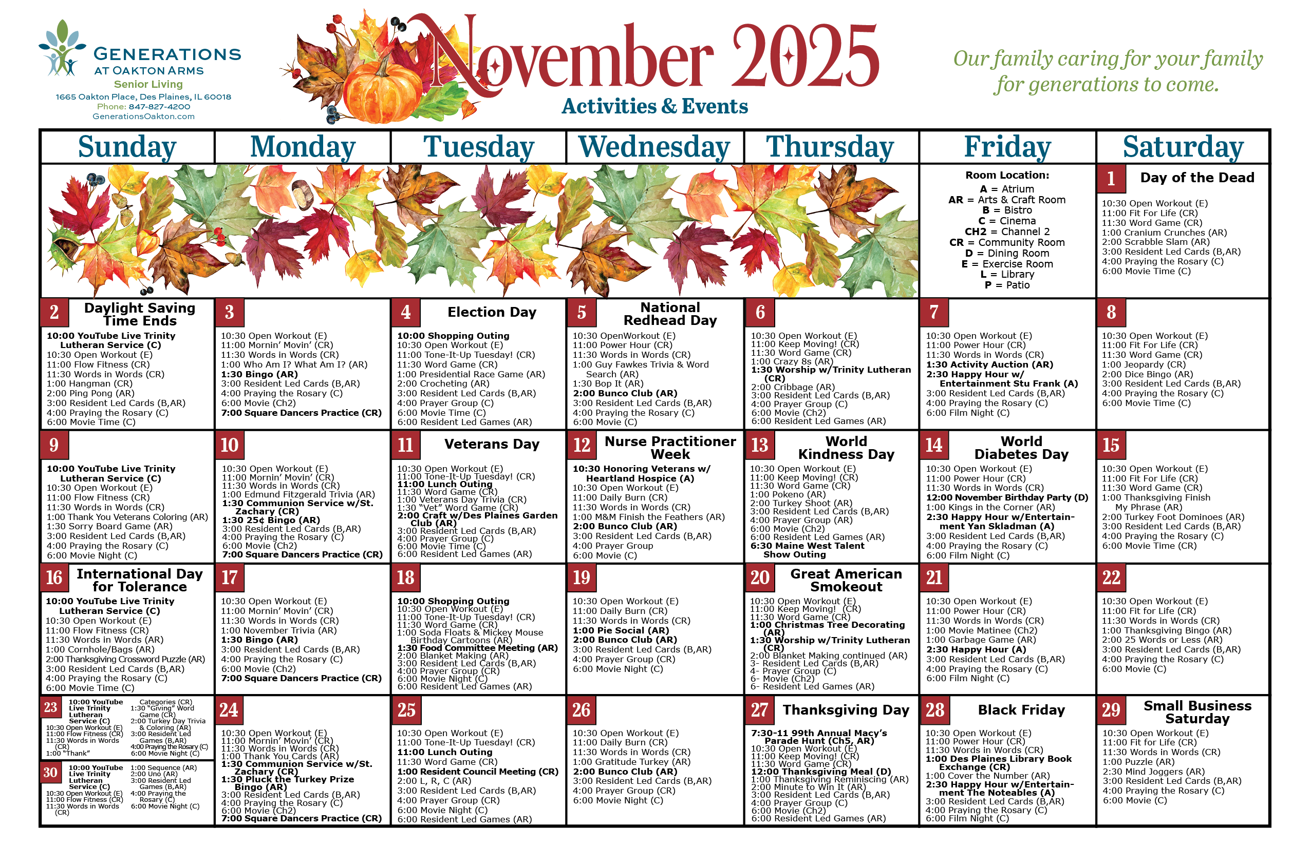 Monthly Calendar – This calendar lays out the scheduled activities for each month, making it easier for our residents to plan out their day and to help families keep tab of their loved one.